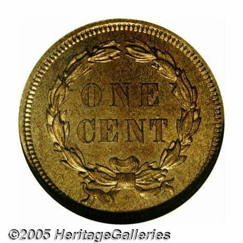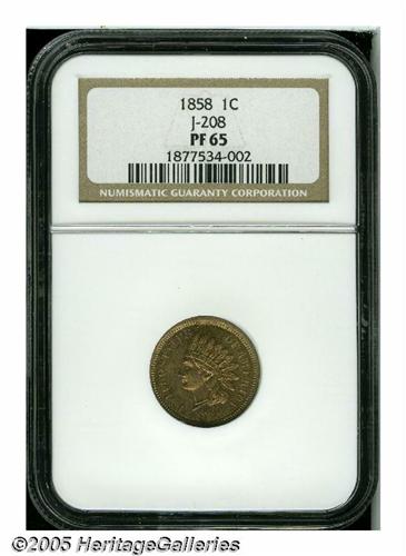 <B>1858<P1C> Indian Cent, Judd-208, Pollock-259, PR65 NGC.</B></I> Breen-1940, Snow-PT28, Die pair 2. The Judd-208 subvariety with a centered date, a broad bust point, and five leaf laurel wreath clusters. One of the popular 'transitional' patterns from 1858, very similar to the 1859 regular issue Indian Cent, which has a narrow bust point and six leaf laurel wreath clusters. Struck in copper nickel alloy with a plain edge. A gorgeous golden-brown Gem with pleasing reflectivity and a hint of softness on the tips of the headdress feathers.