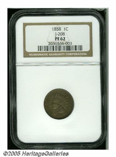 <B>1858<P1C> Indian Cent, Judd-208, Pollock-259, R.1, PR62 NGC.</B></I> The Indian Head Cent design, as adopted in 1859, here with a centered date and clusters of five leaves on the reverse wreath. Struck in copper-nickel with a plain edge. This is the variation with the date centered, and with leaves in clusters of five on the reverse. Andrew Pollock enumerated four different variations of the Judd-208 pattern variety. Sharply struck with olive and pale lilac color on both sides. Indian cents with the 1858 date are highly popular and often collected alongside regular issue cents.<BR><I>Ex: Kagin's (7/74), lot 779.</B></I>