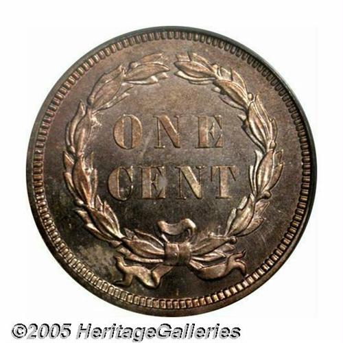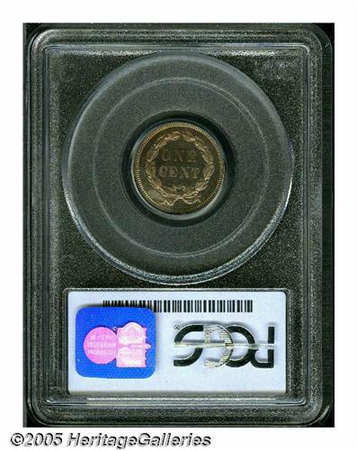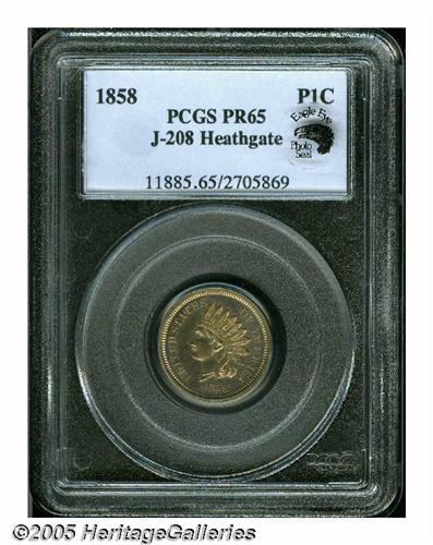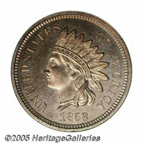 <B>1858<P1C> Indian Cent, Judd-208, Pollock-259, R.4, PR65 PCGS.</B></I> Ex: Heathgate. The Indian Head Cent design, as adopted in 1859, here with a centered date and clusters of five leaves on the reverse wreath. Struck in copper-nickel with a plain edge. This solid Gem specimen is nicely mirrored beneath lilac and pale orange patina. Accompanied by an Eagle Eye Photo Seal (no certificate).<BR><I>From The Western Hills Collection.</B></I>