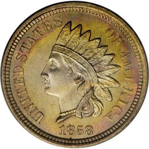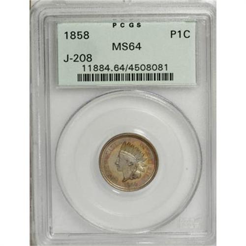 <B>1858 P1C Indian Cent, Judd-208, Pollock-259, Snow-PT28, R.1, MS64 PCGS.</B></I> The obverse has the date centered rather than low with the rounded bust of 1860 and later issues. The reverse has a laurel wreath with five-leaf clusters. Struck in copper-nickel with a plain edge. This available issue is popular with Indian Head cent collectors as a transitional issue. The shining obverse of this Choice piece is yellow-orange around a pale emerald center, while the reverse offers deeper apricot and gold-orange colors. Well-defined with great eye appeal and housed in a green label holder. Population: 11 in 64, 4 finer (7/07).<BR><BR><b>Shipping:</b> Coins & Currency (<a target="_blank" href="http://www.heritageauctions.com/common/shipping.php">view shipping information</a>)