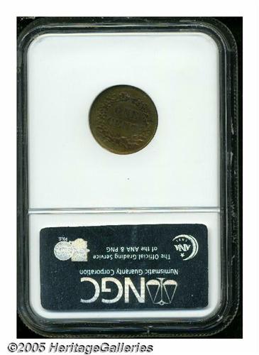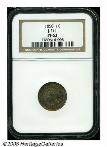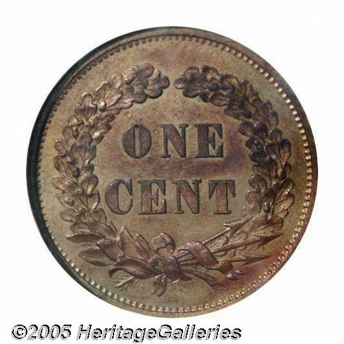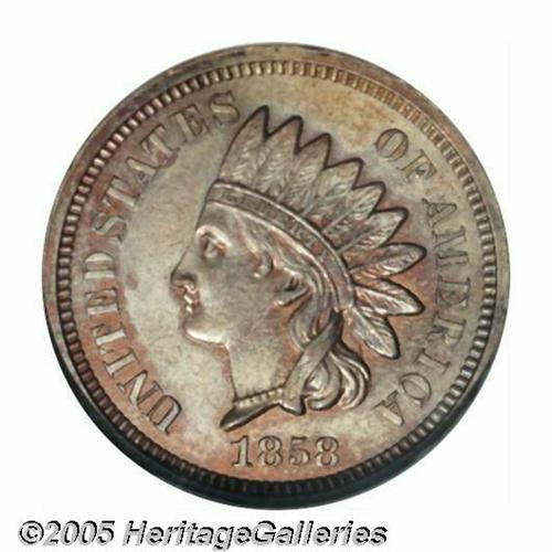 <B>1858<P1C> Indian Cent, Judd-211, Pollock-255, 262, R.4, PR62 NGC.</B></I> The obverse of this popular pattern displays James Barton Longacre's Indian Head motif that appears on the production cent of 1859. The reverse, however, carries a thick oak wreath not unlike that which the Mint would mate with a shield for its 1860 cent production. Struck in copper-nickel with a plain edge. The centered date Pollock variant of Judd-211. The reddish-tan surfaces display deep brick-red color in the protected areas over each side that somewhat subdues the overall appearance.