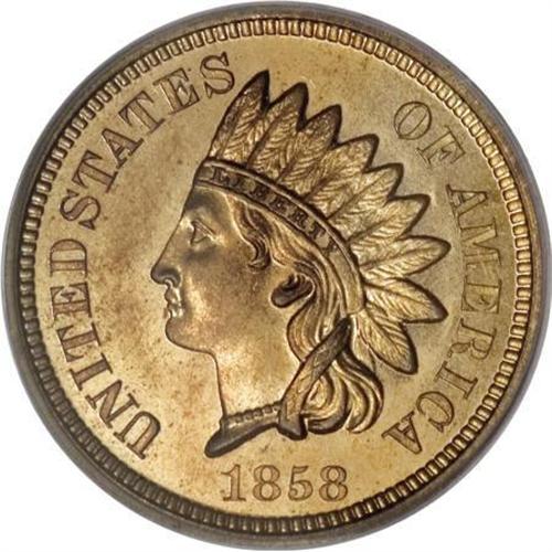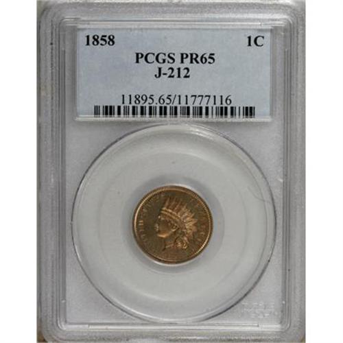 <B>1858 P1C Indian Cent, Judd-212, Pollock-256, 263, R.4, PR65 PCGS.</B></I> The obverse features a broad bust point Indian head. The reverse has an oak wreath and shield, similar to the issued 1860 cent except the shield is broad and has an ornamented border. Struck in copper-nickel with a plain edge. This is the Centered Date variant. Bright and highly reflective in the fields. The surfaces appear "Full Red" if such a designation were possible for a copper-nickel product.<BR><BR><b>Shipping:</b> Coins & Currency (<a target="_blank" href="http://www.heritageauctions.com/common/shipping.php">view shipping information</a>)
