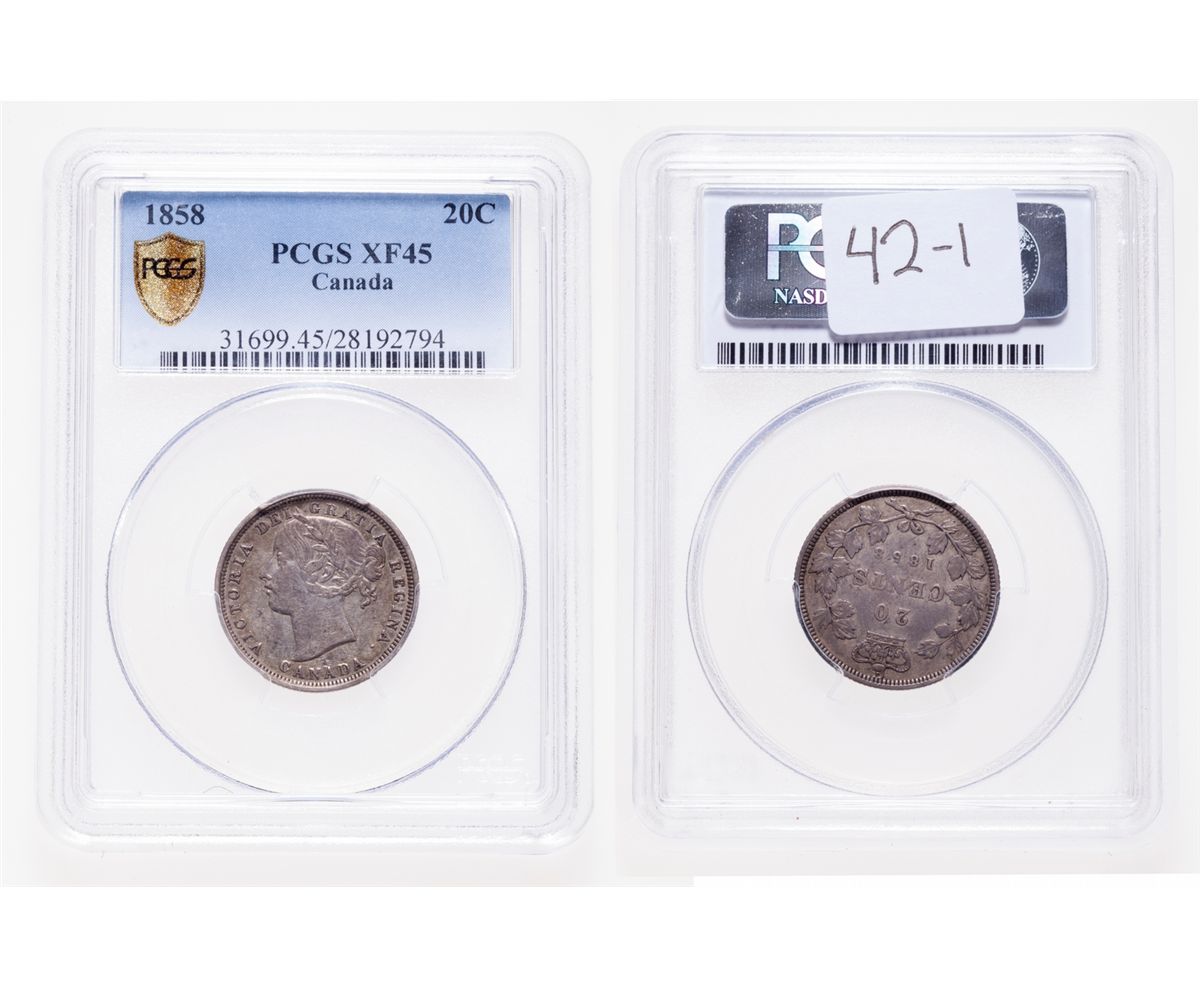 1858. PCGS graded Extra Fine-45. Soft strike. Lightly toned.
