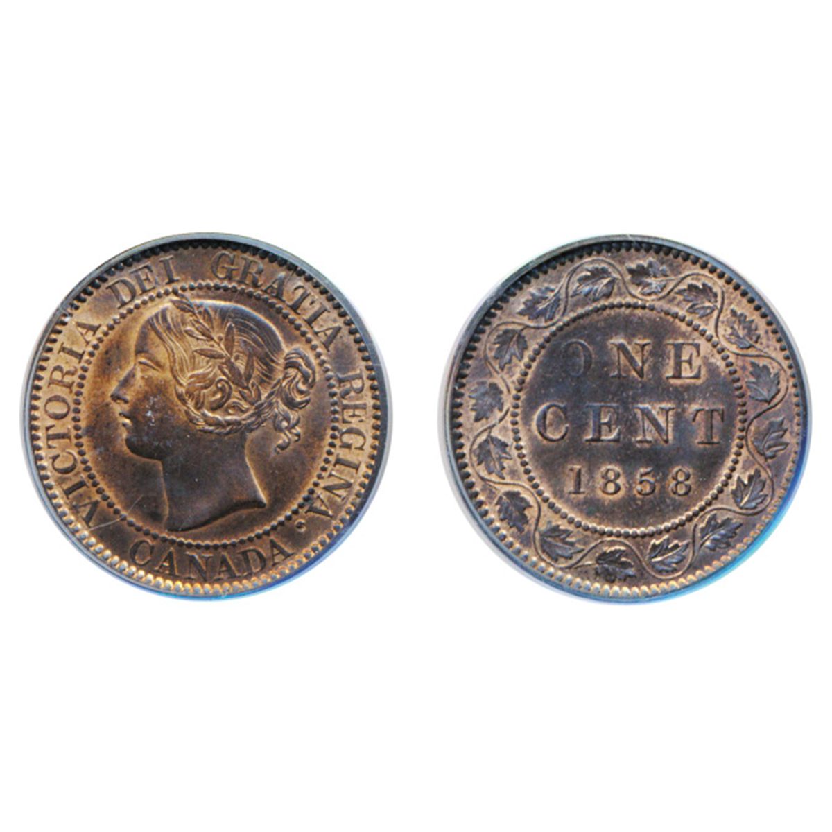 1858. PCGS graded Mint State-64. Red-Brown. 40% evenly distributed luster remains.