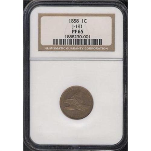 <b>1858 Pattern Cent. Copper-nickel, plain edge. Judd-191. Pollock-233. NGC graded Proof 65.</b> A refreshingly beautiful gem, the color of light coffee with cream, one whose mirror surfaces and intense eye-appealing originality makes it virtually as perfect as the day it made its first appearance at the mint coining press. Indeed, very few examples of this popular Pattern issue have been certified finer. Broadly and well struck on the legends and main eagle device, which is unusual, with other bold details away from the centers.