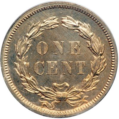 1858 Pattern Cent. Copper-nickel, plain edge. PCGS graded Proof 65. Small eagle with laurel wreath reverse. A sharply struck gem in every respect. The fields are reflective and the surfaces are flawless. No spots, stains, or marks. The fields display fine diagonal die polishing lines from careful die preparation but no hairlines or signs of contact. Light golden tan with a hint of silvery steel overtone on the left side of the obverse. An outstanding example of the Small Eagle/Laurel Wreath combination pattern small cent. Pop 7; 1 finer in 66.