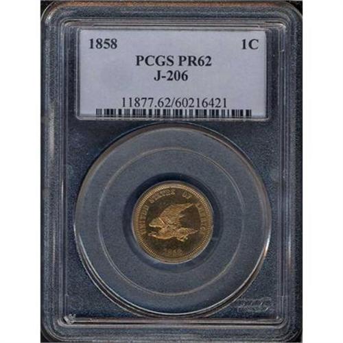 <b>1858 Pattern Cent. Copper-nickel, plain edge. Judd-206. Pollock-242. PCGS graded Proof 62.</b> Lovely sharp design elements on this piece which uses Longacre's small flying eagle design (which never made it onto a working production coin). Some Indian cent and flying eagle cent collectors often add a few of these handsome little patterns to their sets to remind themselves which might have been <b>(PCGS # 11877)</b>