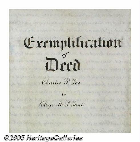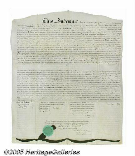<B>1858 Philadelphia Quaker Indenture</B></I> A beautiful, manuscript true copy of an 1830 indenture between Charles P. Fox and his sister, Eliza M. P. Tunis, regarding land they inherited from their mother, Mary Fox, who was the granddaughter of Israel Pemberton (1685-1754), a prominent Quaker and one of the wealthiest men of his time. Charles relinquishes his half-share to his sister in return for one silver dollar. Numerous lots in Philadelphia are mentioned including: Callowhill and Tenth; Wood and Eleventh; Second between High and Chestnut; and Elm between Second and Third. The top is scalloped (or actually, <I>indented</B></I>) and both the green seal and ribbon are intact. 22.75" x 26.5", ideal for display. It would be interesting to research what these lots are worth today. Lot:253
