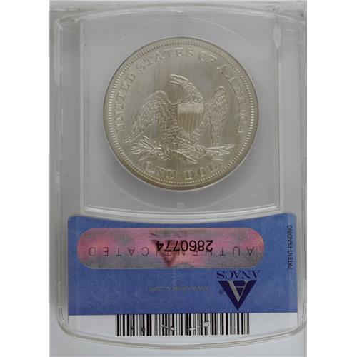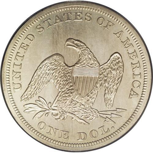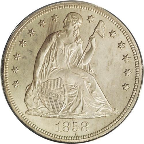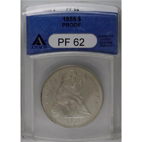 <B>1858<img border='0' src='http://www.heritagecoins.com/images/star.gif' width=10 height=10>$1> PR62 ANACS.</B></I> The 1858 is the sole proof-only date in the Liberty Seated silver dollar series. The 2007 <I>Red Book</B></I> estimates that 300-plus coins were minted, and approximately one-half of that number are thought to be extant today. The design elements on this example are exquisitely brought up, and a thin layer of dove-gray patina covers both sides, interrupted in a few instances by faint streaks of slightly deeper gray-tan. Wispy hairlines are seen under high magnification on Liberty's cheek and neck and in the fields of both sides. This is one of the most respected and sought-after coins in American numismatics.