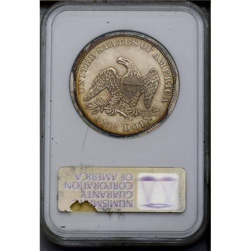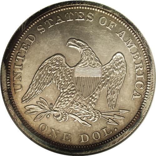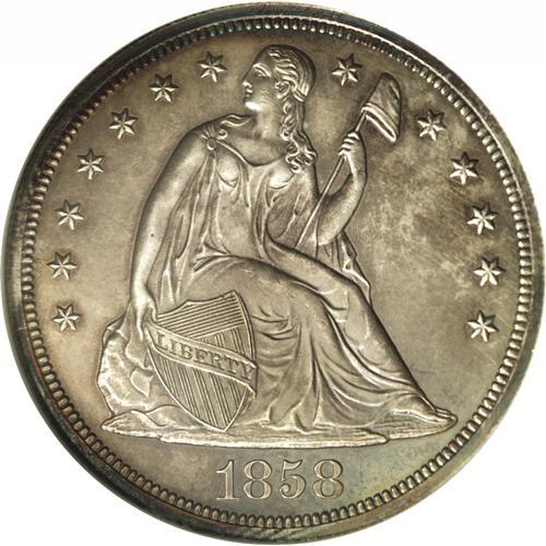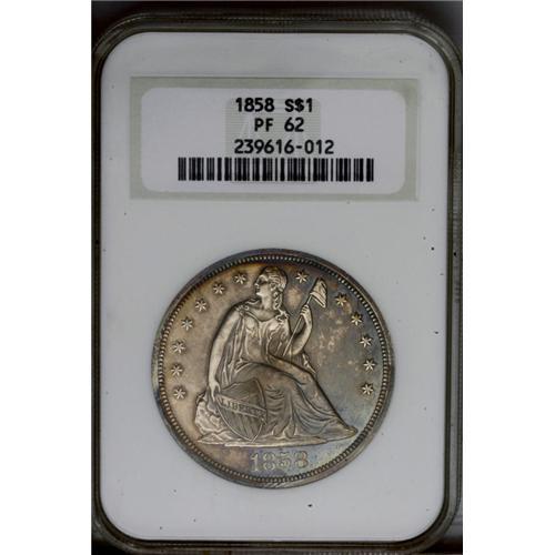 <B>1858<img border='0' src='http://www.heritagecoins.com/images/star.gif' width=10 height=10>$1> PR62 NGC.</B></I> The 1858 Seated dollar is a well known rarity in a low-profile series that is replete with challenging issues. No business strikes were produced in 1858, and it is far from clear just how many proofs were struck. For many years it was generally accepted that 80 or so pieces were minted, but recent estimates by Bowers and others have increased severalfold to the 250-300 range. This suitably mirrored specimen is draped in antique-golden and cobalt-blue patina. Numerous wispy hairlines, while detrimental to the coin's grade, have little effect on either the reflective qualities or the appeal. Census: 8 in 62, 33 finer (3/06).<BR><I>From The Steve Glenn Collection.</B></I> <BR><BR><B>Important notice:</B> Heritage usually auctions material at the rate of 200-250 lots per hour. On some occasions eBay Live bid software or the Internet may not be able to keep up with the pace of the auction. We recommend placing a realistic absentee bid now as insurance to avoid disappointment. Occasionally the auctioneer may eliminate or reject an eBay Live bid, and the auctioneer may also reopen a lot after the close of the eBay live bidding (usually because we missed an audience bid), and may reject your bid even if it shows you as the winning bidder. By bidding via eBay Live, you agree that Heritage may award the lot to another bidder at its sole discretion under the circumstances described above or any other reasonable circumstances. Since eBay bids are not shown to us until we open the lot on the floor, we treat those bids just like floor bids. In most cases the floor responds before the eBay bid is presented to us, due to Internet lag time, so for consistency we have made it a policy that floor bids are always considered first over tie eBay live bids. Also please note that all Heritage lots purchased through eBay Live carry a 20% Buyer's Premium. Please make sure you read the Terms and Conditions before you bid. This lot is being auctioned in conjunction with a live floor auction by Heritage Galleries & Auctioneers. All final auction and invoice information will be supplied by Heritage Galleries & Auctioneers, and all other information should be considered preliminary. Lot:2203 <BR><BR><B>Winning Notification and Billing:</B> After the FINAL session in this auction is complete, Heritage will send e-mail and snail mail invoices. This process normally takes several days. All final auction and invoice information will be supplied by Heritage Galleries & Auctioneers, and all other information should be considered preliminary. <BR><BR>This auction will be conducted on a live auction floor and over the Internet through eBay Live. If you choose to place an absentee bid, please take a moment to <font color='#0000ff'><u><a href='http://pages.ebay.com/liveauctions/help/before/laabsentee.html'>learn how eBay Live absentee bidding works</a></u></font><font color='#000000'>