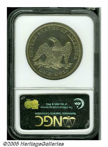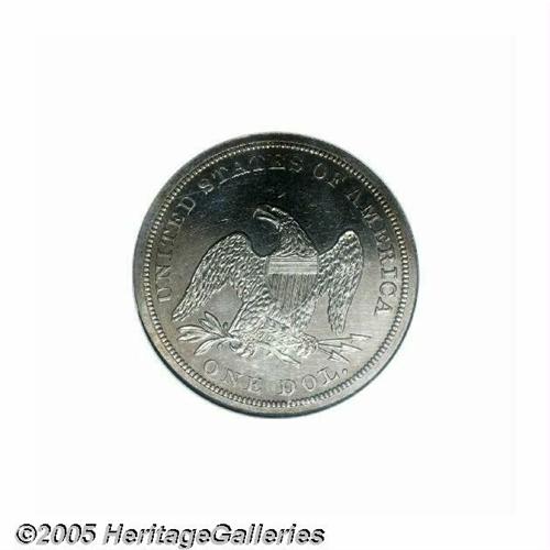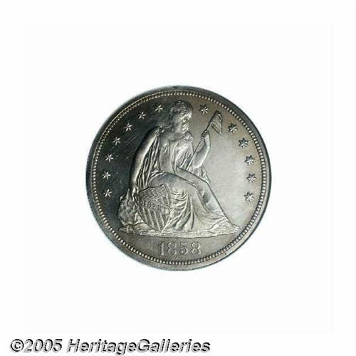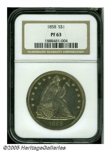 <B>1858<S$1> PR63 NGC.</B></I> The 1858 Seated dollar is one of the most respected and highly sought-after silver coins in U.S. numismatics. While it is known that no business strikes were produced of this date, it is far from clear just how many proofs were struck. The Mint did not start keeping proof mintage records until the following year. Estimates have ranged from as low as 80 coins (per S. Hudson and Henry Chapman) to as high as 600 coins extant (per the <I>Gobrecht Journal,</B></I> July 1982). All we can do with certainty is quote combined NGC and PCGS population data, which lists 145 coins in all grades (5/05). Naturally, some of these "coins" are probably resubmissions of the same specimens. This particular piece has flashy, deeply reflective fields with just a hint of light golden color on each side. Lightly hairlined, the only contact marks of note are located in the upper reverse fields above the eagle's wings. Population: 28 in 63, 9 finer (5/05).<BR><I>From our February 2005 Long Beach Sale.</B></I>