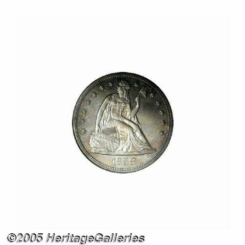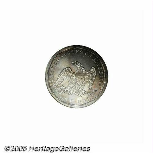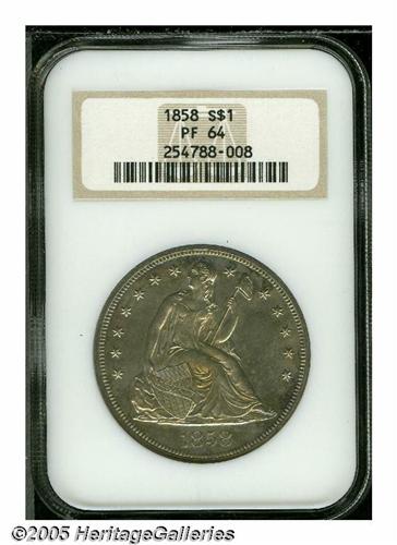 <B>1858<S$1> PR64 Seated Dollar NGC.</B></I> Apricot, gunmetal-gray, and lemon hues adorn this needle-sharp and impressively preserved Choice Seated Dollar. Careful examination of the attractively reflective fields does not reveal more than a few trivial hairlines, which do not appear to limit the grade. Proof Seated Dollars are actively collected by advanced numismatists, and the low mintage 1858 is elusive relative to the later proof issues of the series. Population: 7 in 64, 9 finer (6/05).