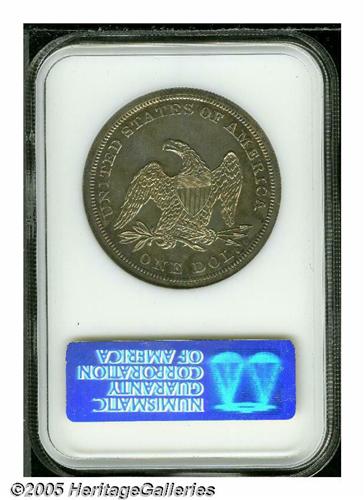 1858 S$1 PR64 Seated Dollar NGC. Apricot, gunmeta