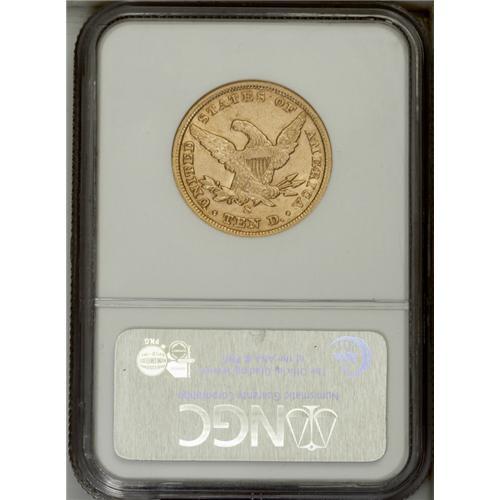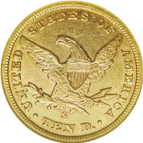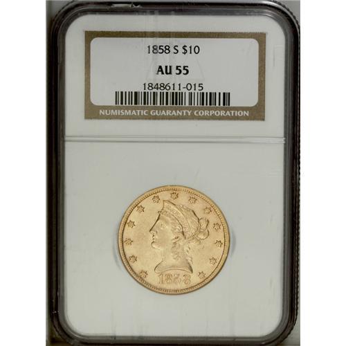 <B>1858-S $10 AU55 NGC.</B></I> Bright luster connects many of the obverse stars, and the reverse border has an unbroken band of peripheral luster. Small scattered marks are inevitable for the grade, but none singularly distract. The 1854-S and 1856-S are the only relatively available San Francisco No Motto issues. The 1858-S is rare regardless of grade. Only 11,800 pieces were struck.<BR><BR><b>Shipping:</b> Coin/Currency (<a target="_blank" href="http://www.heritageauctions.com/common/shipping.php">view shipping information</a>)