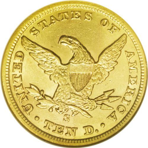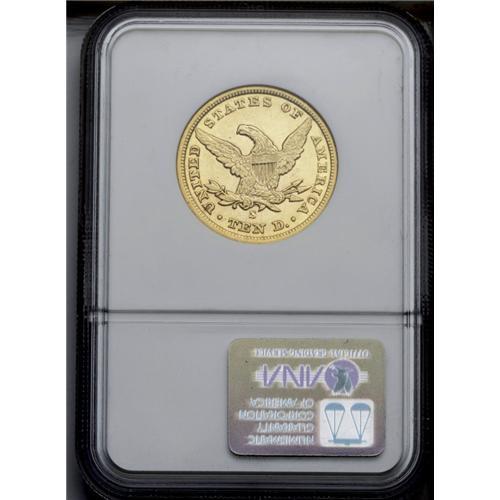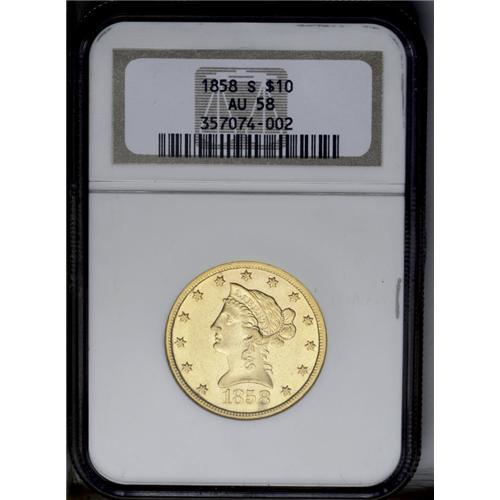 <B>1858-S<$10> AU58 NGC.</B></I> The 1858-S Liberty eagle is of sufficient rarity that it is, in fact, comparable to the much better known P-mint issue from this year. Only 11,800 pieces were struck. In 1980, David Akers rated the '58-S in the top 10% of the entire series in terms of rarity, according to frequency of auction appearances. The surfaces on this piece display light orange-gold coloration, with faint greenish accents. A bit softly struck on the obverse stars, the coin is only slightly abraded, and there are substantial portions of mint frost on each side. Not a single example has been certified in Mint State, by either of the major grading services, making this high-end AU58 specimen a significant offering in the numismatic marketplace. Census: 11 in 58, 0 finer (8/06).<BR><I>From The Clifton Rodenburg Collection.</B></I>