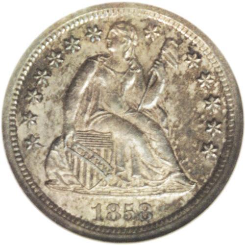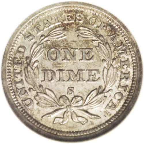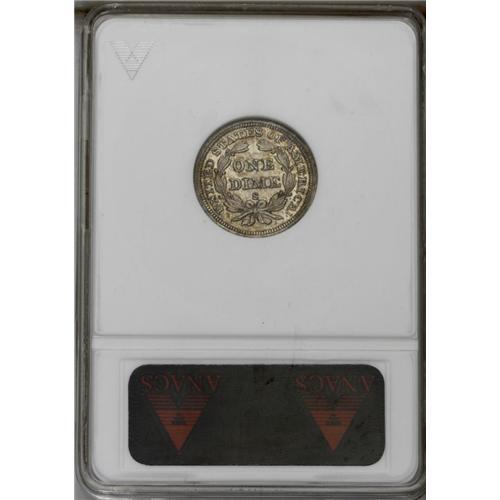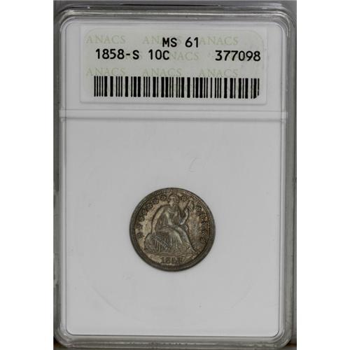 <B>1858-S<10C> MS61 ANACS.</B></I> Fortin-102. The pendant is centered over the 5, and the left bottom serif of the 1 ends over the left side of a denticle. A rare coin in all grades due to the minuscule mintage of 60,000 pieces, most of which entered circulation in rough-and-tumble San Francisco immediately. About 15 years ago, this issue was thought to be unknown in Mint State, but a few Uncirculated pieces have been certified since then. The present example has fairly heavy, mottled russet-gray toning that covers much of each side, and a bit of planchet roughness is noted. There is strictly no trace of wear, of course, and the strike is actually well executed. The enormous S mintmark is above the bow. An rare opportunity for Seated dime specialists.
