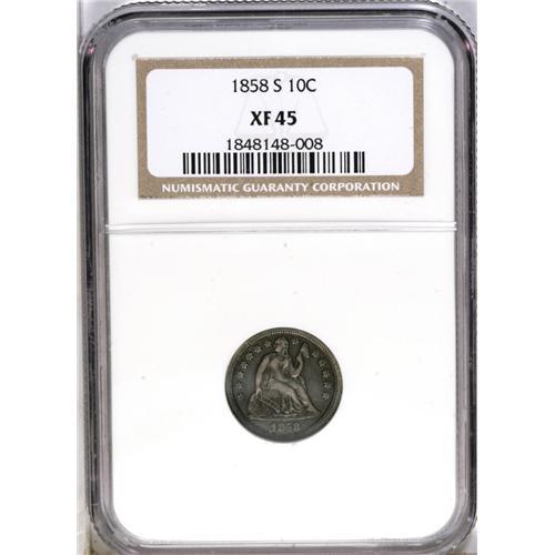 <B>1858-S<10C> XF45 NGC.</B></I> Medium gray toning shows hints of light blue. A nice piece for the grade, with relatively strong definition. A small mark on Liberty's left (right facing) breast and another in the lower left obverse field do not pose major problems. A scarce date in all grades, from a mintage of 60,000 pieces.