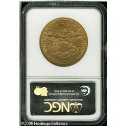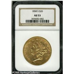 <B>1858-S $20 AU53 NGC.</B></I> One of several examples of this better date S-mint in this sale. This is an especially lustrous coin that displays generous reddish patina around the margins. The most distracting mark is a scratch in the lower right obverse field. Lot:8977