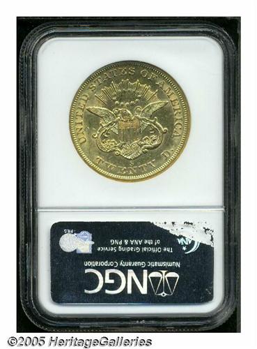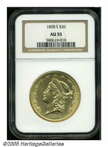 <B>1858-S<$20> AU55 NGC.</B></I> This rare date issue was not coined until after the 1857 loss of the <I>S.S. Central America,</B></I> thus no examples were recovered in that treasure. As a result, high-quality examples of this issue are quite rare. Other treasures of later years, including the 1865 <I>Republic</B></I> and <I>Brother Jonathan</B></I> treasures did not have any significant quantity of this date. This is a splendid example with rich yellow-gold luster and only a trace of wear on the high points. A couple of heavy abrasions are noted on Liberty's cheek.