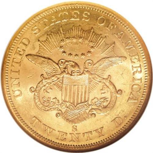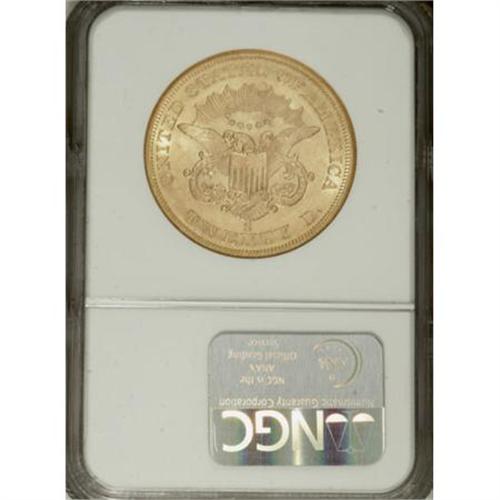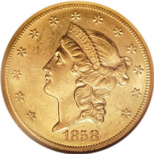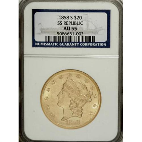 <B>1858-S $20 AU55 NGC.</B></I> Ex: <I>S.S. Republic.</B></I> Though it survived service in the Civil War on both sides of the conflict, the <I>S.S. Republic</B></I> sank as a civilian vessel in late October 1865. Its cargo of gold coins included a number of Type One double eagles, such as the briefly circulated 1858-S example offered here. The lightly abraded yellow-gold surfaces retain the vast majority of their original luster, though the highpoints of the well-defined devices show minor but distinct wear. A presentation case, booklet, and DVD from Odyssey Marine Exploration accompanies the lot.<BR><I>From The Arroyo Grande Collection.</B></I><BR><BR><B>Coin Engraver:</B> James B. Longacre<BR><BR><b>Shipping:</b> Coins & Currency (<a target="_blank" href="http://www.heritageauctions.com/common/shipping.php">view shipping information</a>)