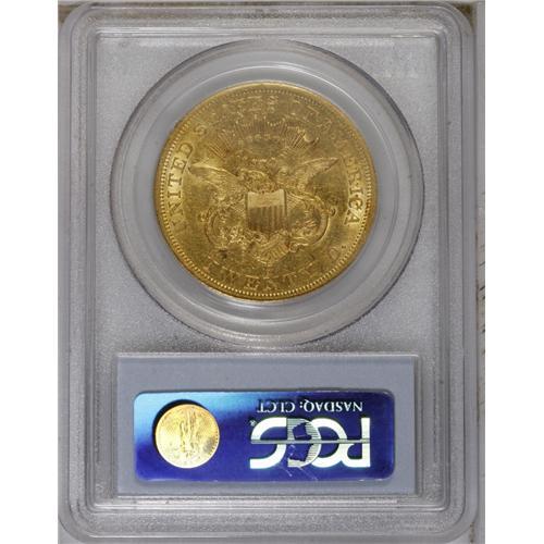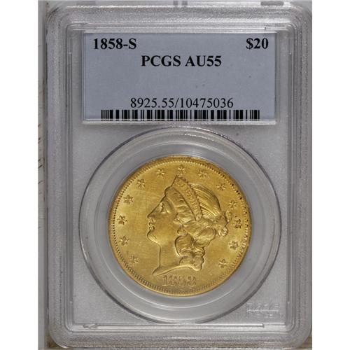 1858-S $20 AU55 PCGS. A nicely struck example with sig