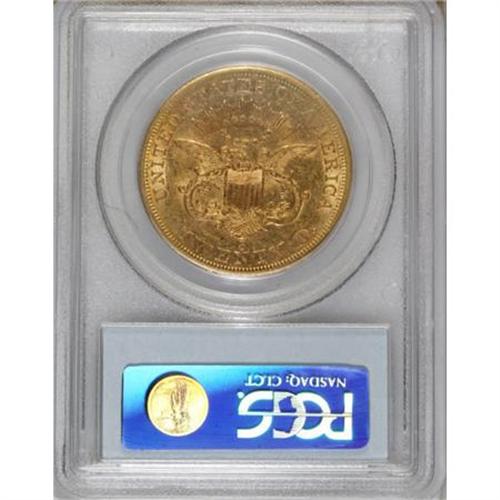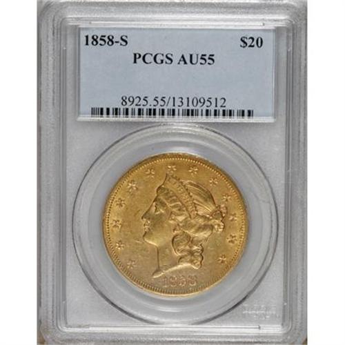 <B>1858-S $20 AU55 PCGS.</B></I> Struck too late to emerge from the <I>S.S. Central America </B></I>shipwreck, yet too early to be a major player in the <I>S.S. Brother Jonathan </B></I>hoard. Luster dominates protected areas of this moderately abraded green-gold representative. Population: 35 in 55, 38 finer (4/07).<BR><BR><b>Shipping:</b> Coins & Currency (<a target="_blank" href="http://www.heritageauctions.com/common/shipping.php">view shipping information</a>)