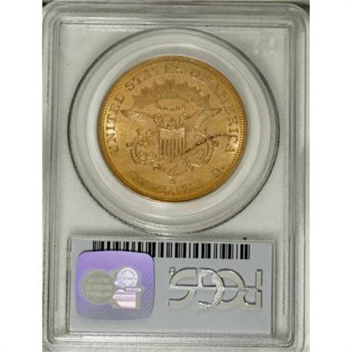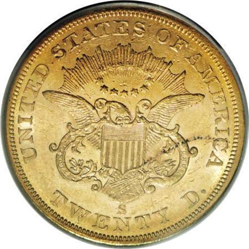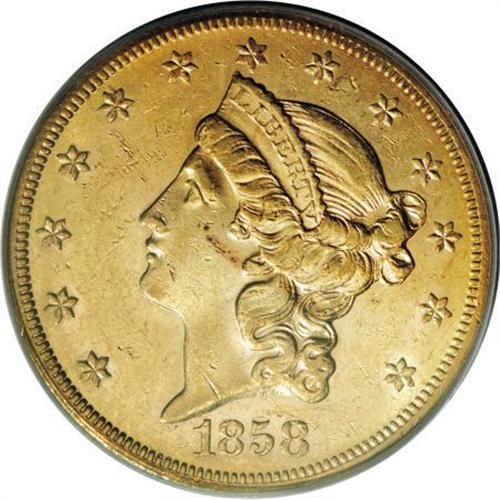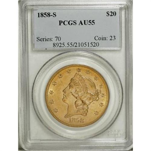 <B>1858-S $20 AU55 PCGS.</B></I> "Not surprisingly, most of the 1858-S double eagles seen are low grade and heavily abraded, as the issue saw heavy commercial use," according to Garrett and Guth (2006). This piece shows the typical extensive abrasions, but is also quite attractive by virtue of considerable luster and deep rose-gold toning. The design elements are crisply struck on both sides. A brief coppery streak is noted on Liberty's cheek, close to the hair. Population: 37 in 55, 51 finer (11/07). <BR><BR><B>Coin Engraver:</B> James B. Longacre<BR><BR><b>Shipping:</b> Coins & Currency (<a target="_blank" href="http://www.heritageauctions.com/common/shipping.php">view shipping information</a>)