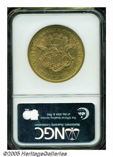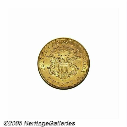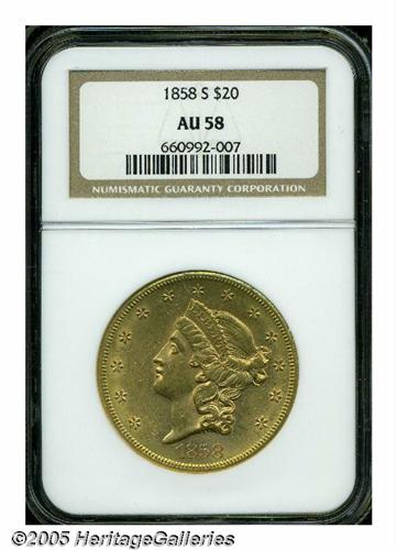 <B>1858-S<$20> AU58 NGC.</B></I> A whisper of friction on the wingtips and the cheek denies Uncirculated status, but glimpses of the original cartwheel luster emerge throughout the exposed fields. A sharply struck reddish-gold representative with refreshingly unabraded surfaces. Although the 1857-S has survived in high grades due to the recovery of the <I>S.S. Central America,</B></I> the 1858-S becomes a significant scarcity at the near-Mint level.