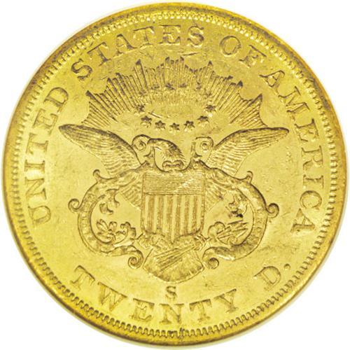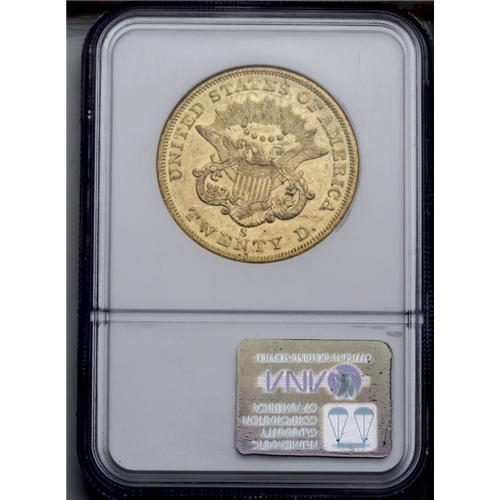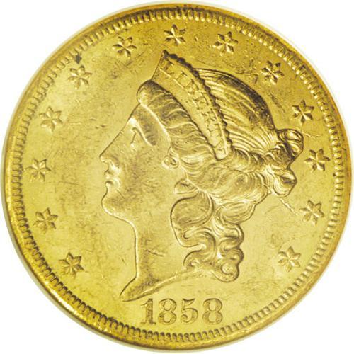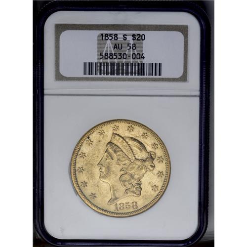 <B>1858-S<$20> AU58 NGC.</B></I> Most known examples of the 1858-S double eagle grade either VF or XF, according to David Akers. This near-Mint specimen should be well above average for the issue. Numerous small and a few moderate blemishes are noted on each side. The green-gold surfaces retain a great deal of luster.<BR><I>From The Clifton Rodenburg Collection.</B></I>
