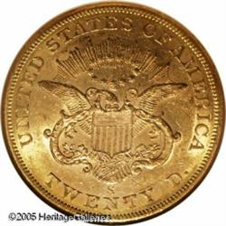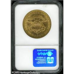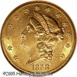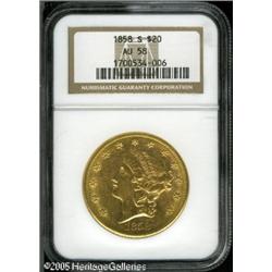 <B>1858-S $20 AU58 NGC.</B></I> The 1858-S is a somewhat overlooked issue that has not seen a dramatic increase in obtainability like some of its S-mint brethren. This moderately abraded example is very well struck and has pleasing reddish-golden color.<BR><I>From The Mike Jacobson Collection.</B></I> Lot:8982
