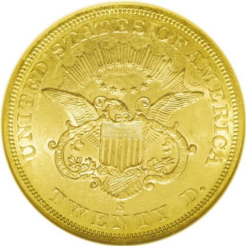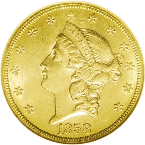<B>1858-S<$20> AU58 NGC.</B></I> This is an easily obtainable date now that examples have been recovered in the <I>S.S. Republic</B></I> treasure, and yet it is still a rarity in higher grades. Although that treasure yielded 64 examples of this date, according to NGC Census data, only seven of those were graded MS60 or better. Winter and Crum published their reference prior to dispersal of this treasure, thus their comments reflect the state of double eagle affairs prior to this discovery: "Because of the fact that other San Francisco double eagles of this era have had their populations swelled by hoards, the 1858-S has become somewhat of a forgotten issue. It is a much scarcer coin than most people realize, especially in higher grades." This date was minted after the <I>S.S. Central America</B></I> disaster, and several years before the <I>S.S. Brother Jonathan</B></I> accident, thus was not a factor in either of those treasures. In fact, just seven examples were sold from the latter hoard, with the finest graded just AU50.<BR> This example is a splendid specimen with sharp design elements and brilliant yellow gold surfaces. Both sides exhibit wonderful frosty luster. The surfaces of this example are finer than usual, and this issue normally comes with excellent eye appeal.<BR><I>From The Wyoming Collection.</B></I>