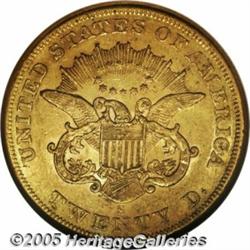 <B>1858-S $20 AU58 NGC.</B></I> This rare date issue was not coined until after the 1857 loss of the <I>S.S. Central America,</B></I> thus no examples were recovered in that treasure. As a result, high-quality examples of this issue are quite rare. Other treasures of later years, including the 1865 <I>Republic</B></I> and <I>Brother Jonathan</B></I> treasures did not have any significant quantity of this date. This is a splendid example with rich yellow-gold luster and only a trace of wear on the high points.