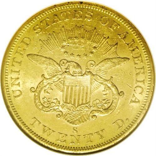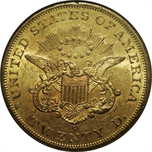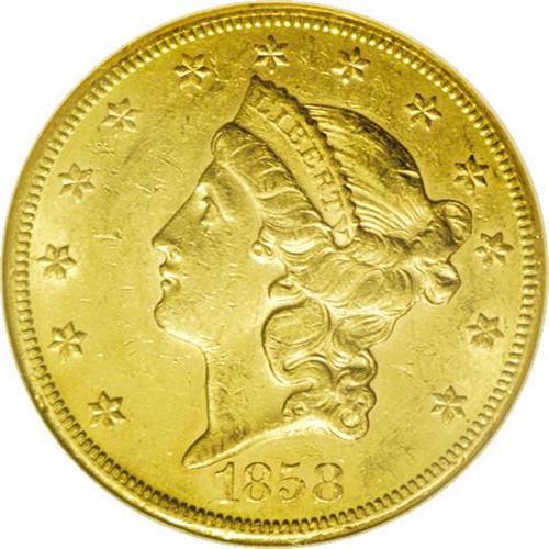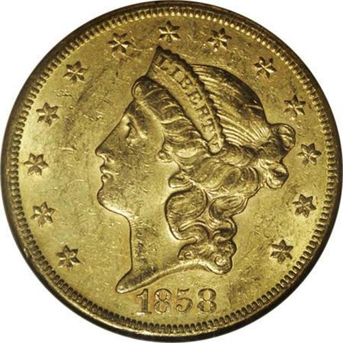 <B>1858-S $20 AU58 NGC.</B></I> Well defined with abundant luster and light contact marks. Some subtle pink color is seen as the coin rotates under a light. An issue that remains very scarce in conditions of AU and above.