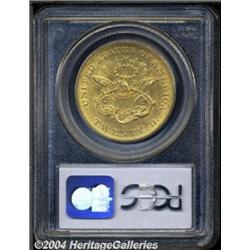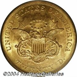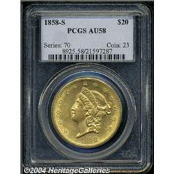 <B>1858-S<$20> AU58 PCGS.</B></I> A whisper of friction on the wingtips and the cheek denies Uncirculated status, but glimpses of the original cartwheel luster emerge throughout the exposed fields. A sharply struck lemon-gold representative with refreshingly unabraded surfaces. Although the 1857-S has survived in high grades due to the recovery of the <I>S.S. Central America,</B></I> the 1858-S becomes a significant rarity at the near-Mint level. Population: 20 in 58, 12 finer (3/04). <BR><BR><B>Important notice:</B> Heritage usually auctions material at the rate of 200-250 lots per hour. On some occasions eBay Live bid software or the Internet may not be able to keep up with the pace of the auction. We recommend placing a realistic absentee bid now as insurance to avoid disappointment. Occasionally the auctioneer may eliminate or reject an eBay Live bid, and the auctioneer may also reopen a lot after the close of the eBay live bidding (usually because we missed an audience bid), and may reject your bid even if it shows you as the winning bidder. By bidding via eBay Live, you agree that Heritage may award the lot to another bidder at its sole discretion under the circumstances described above or any other reasonable circumstances. Since eBay bids are not shown to us until we open the lot on the floor, we treat those bids just like floor bids. In most cases the floor responds before the eBay bid is presented to us, due to Internet lag time, so for consistency we have made it a policy that floor bids are always considered first over tie eBay live bids. Also please note that all Heritage lots purchased through eBay Live carry a 20% Buyer's Premium. Please make sure you read the Terms and Conditions before you bid. </span></font></tr></table></td></tr></table>