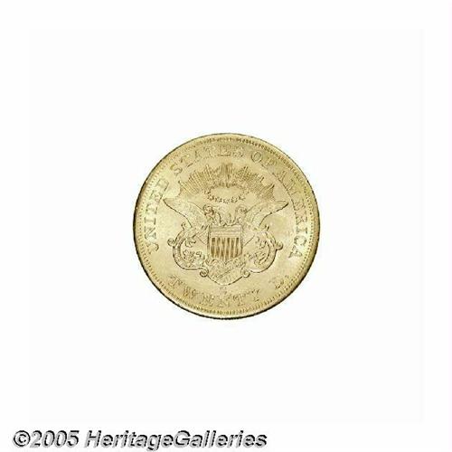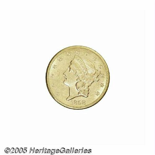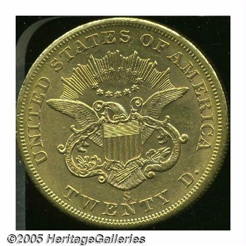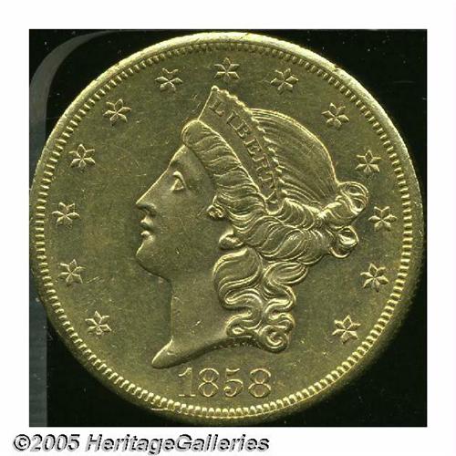 <B>1858-S<$20> MS60 Cleaned, Uncertified.</B></I> Bright and flashy, but there are wispy hairlines from a past cleaning present on both sides. Sharply struck by the dies, and otherwise quite attractive for the grade. Traces of luster in the protected areas.