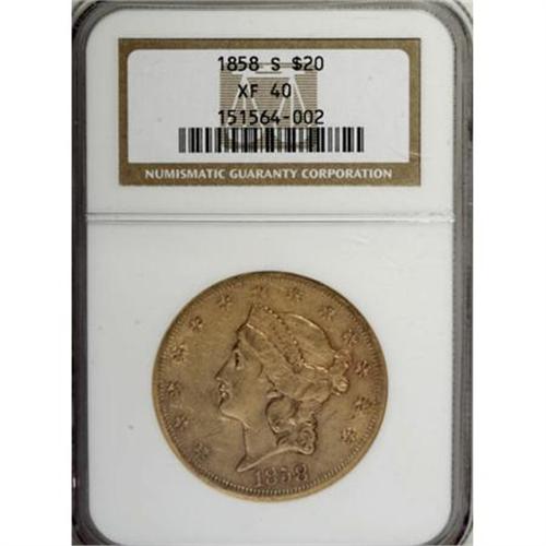 <B>1858-S $20 XF40 NGC.</B></I> This luminous mustard-gold twenty shows light khaki accents at the margins and small spots of alloy at the upper reverse. Typically struck with the usual wispy abrasions and a more significant mark that travels from the left obverse rim to Liberty's neck.<BR><I>From The York/Hallenbeck #2 Current Finest PCGS Registry Set of Liberty Double Eagles.</B></I><BR><BR><B>Coin Engraver:</B> James B. Longacre<BR><BR><b>Shipping:</b> Coins & Currency (<a target="_blank" href="http://www.heritageauctions.com/common/shipping.php">view shipping information</a>)