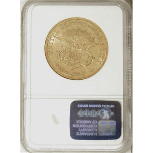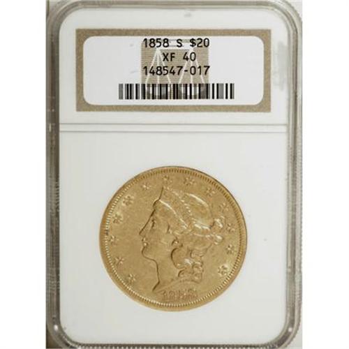 <B>1858-S $20 XF40 NGC.</B></I> NGC Census: (42/583). PCGS Population (33/243). Mintage: 846,710. Numismedia Wsl. Price for NGC/PCGS coin in XF40: $800. (#8925)<BR><BR><B>Coin Engraver:</B> James B. Longacre<BR><BR><b>Shipping:</b> Coins & Currency (<a target="_blank" href="http://www.heritageauctions.com/common/shipping.php">view shipping information</a>)