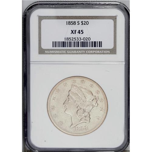 1858-S $20 XF45 NGC. A radiant straw-gold example from