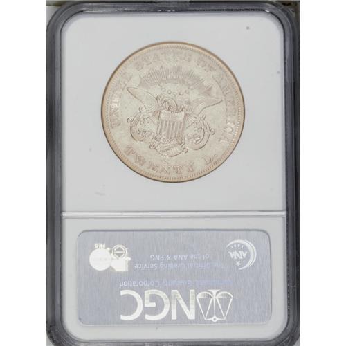 <B>1858-S<$20> XF45 NGC.</B></I> A radiant straw-gold example from the early days of the San Francisco Mint. The strike is typical, and traces of luster remain at the periphery of the moderately marked surfaces.