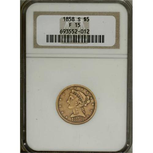 <B>1858-S $5 F15 NGC.</B></I> NGC Census: (1/55). PCGS Population (1/25). Mintage: 18,600. Numismedia Wsl. Price for NGC/PCGS coin in F15: $585. (#8279)<BR><BR><B>Coin Engraver:</B> Christian Gobrecht<BR><BR><b>Shipping:</b> Coins & Currency (<a target="_blank" href="http://www.heritageauctions.com/common/shipping.php">view shipping information</a>)