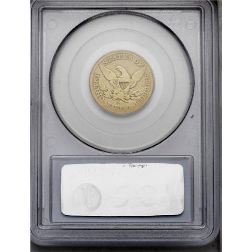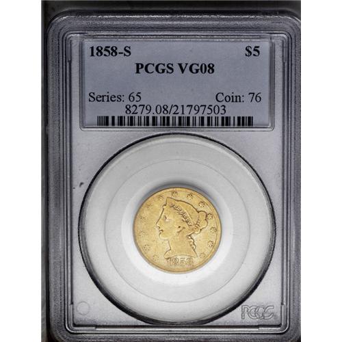<B>1858-S<$5> VG8 PCGS.</B></I> This fairly worn specimen displays honey-gold surfaces imbued with traces of light green. The central devices show some internal detail.<BR><I>From The Steve Glenn Collection.</B></I> <BR><BR><B>Important notice:</B> Heritage usually auctions material at the rate of 200-250 lots per hour. On some occasions eBay Live bid software or the Internet may not be able to keep up with the pace of the auction. We recommend placing a realistic absentee bid now as insurance to avoid disappointment. Occasionally the auctioneer may eliminate or reject an eBay Live bid, and the auctioneer may also reopen a lot after the close of the eBay live bidding (usually because we missed an audience bid), and may reject your bid even if it shows you as the winning bidder. By bidding via eBay Live, you agree that Heritage may award the lot to another bidder at its sole discretion under the circumstances described above or any other reasonable circumstances. Since eBay bids are not shown to us until we open the lot on the floor, we treat those bids just like floor bids. In most cases the floor responds before the eBay bid is presented to us, due to Internet lag time, so for consistency we have made it a policy that floor bids are always considered first over tie eBay live bids. Also please note that all Heritage lots purchased through eBay Live carry a 20% Buyer's Premium. Please make sure you read the Terms and Conditions before you bid. This lot is being auctioned in conjunction with a live floor auction by Heritage Galleries & Auctioneers. All final auction and invoice information will be supplied by Heritage Galleries & Auctioneers, and all other information should be considered preliminary. Lot:2742 <BR><BR><B>Winning Notification and Billing:</B> After the FINAL session in this auction is complete, Heritage will send e-mail and snail mail invoices. This process normally takes several days. All final auction and invoice information will be supplied by Heritage Galleries & Auctioneers, and all other information should be considered preliminary. <BR><BR>This auction will be conducted on a live auction floor and over the Internet through eBay Live. If you choose to place an absentee bid, please take a moment to <font color='#0000ff'><u><a href='http://pages.ebay.com/liveauctions/help/before/laabsentee.html'>learn how eBay Live absentee bidding works</a></u></font><font color='#000000'>