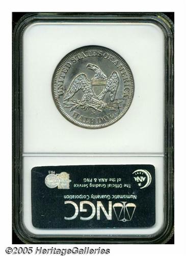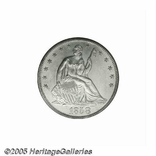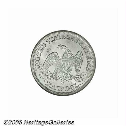 <B>1858-S<50C> MS66 NGC.</B></I> This is the Large Mintmark variety, and on this reverse the mintmark is placed high in the field, with the upper right serif lightly touching the stem. Although seven different reverse dies are mentioned by Wiley and Bugert, only one major variety listing is identified in their reference. All 1858-S half dollars are rare in Mint State grades, and Gem quality coins are exceedingly rare. In fact, this is the only example of the date to be certified in MS66 grade with none finer. Likewise, PCGS has graded a single MS66 example, also with none finer. This example is fully struck with complete design details on both sides. The surfaces are brilliant light gray with satiny luster. A couple small splashes of iridescent toning are visible on the reverse. A few minor die cracks are seen on both sides of this intermediate die state example. Population: 1 in 66, 0 finer (2/05).