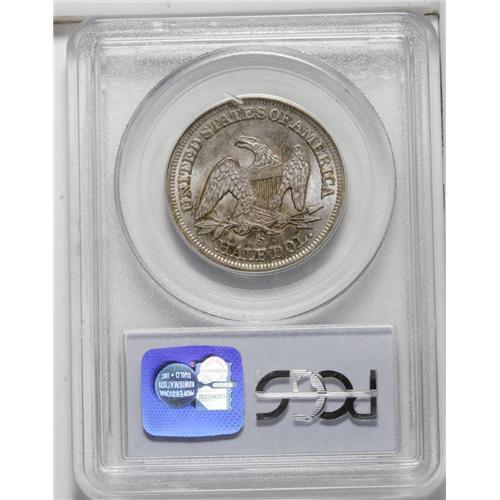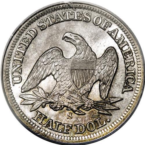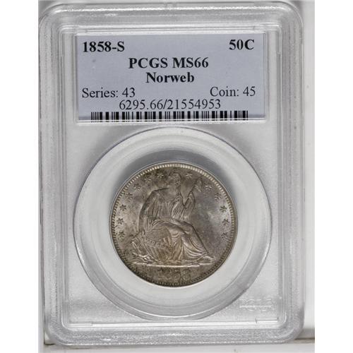 <B>1858-S 50C MS66 PCGS.</B></I> Ex: Norweb. WB-103. Errant 8 in Rock. The bottom loop of an 8 can be seen punched into the base of the rock above the second 8 in the date. The WB-103 is a scarcer variety within the context of 1858-S halves. Randy Wiley and Bill Bugert, in their <I>Complete guide to Liberty Seated Half Dollars,</B></I> assign an R.6+ rarity rating to Mint State 1858-S half dollars (13-18 pieces estimated to exist). When likely resubmissions are taken into account, this estimate is more or less in line with the population figures, where to date, PCGS and NGC have seen 26 Uncirculated examples. A mere two pieces have been certified in MS66, making the example offered in this lot tied for finest known!<BR> Wisps of beautiful lavender and bluish-gray patina, imbued with traces of orange, rest upon lustrous, frosted surfaces. A well executed strike manifests itself in bold detail on Liberty's hair, gown, and sandal, and on the star centers and eagle's plumage. A few minute, unobtrusive contact marks on the right (left facing) arm are mentioned as possible pedigree identifiers. Population: 1 in 66, 0 finer (10/06).<BR><BR><b>Shipping:</b> Coin/Currency (<a target="_blank" href="http://www.heritageauctions.com/common/shipping.php">view shipping information</a>)