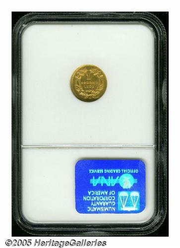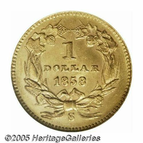 <B>1858-S<G$1> MS62 NGC.</B></I> Our consignor, a gentleman who truly enjoys his numismatic delicacies, noted the following about this gold dollar: "One of an issue of only 10,000. As Akers notes, 'strictly Uncirculated examples are all but non-existent.' Richly lustrous. A treasure of this popular gold series, and still very underrated!" In his <I>Complete Encyclopedia,</B></I> Walter Breen also noted that this is extremely rare in Mint State. NGC supports this position, as just nine examples have been certified in all Mint State grades, and none any finer than this one. It is sharply struck with brilliant yellow-gold color and wisps of orange toning. The surfaces on both sides are fully lustrous and lightly reflective.