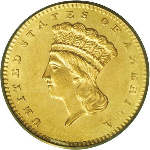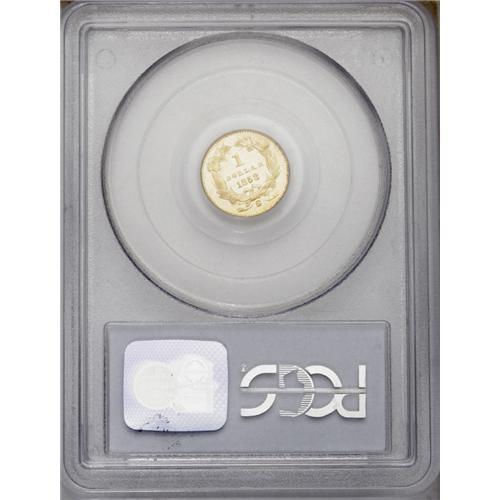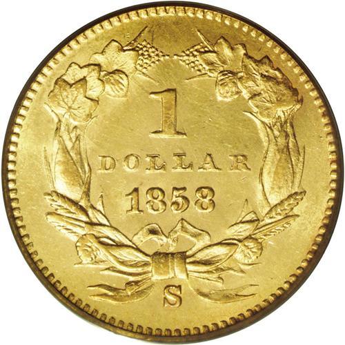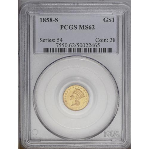 <B>1858-S<G$1> MS62 PCGS.</B></I> Any Mint State 1858-S gold dollar is rare, and especially so in this grade or finer grade levels. The PCGS population will clearly bear this out. Struck in the fifth year of operations at the new San Francisco Mint, and in this case from a mintage of just 10,000 coins. As gold coins were so desperately needed in San Francisco, nearly all examples entered circulation at the time they were struck, explaining the rarity of high-grade coins. Some light scrapes on Liberty's cheek and neck prevent a higher grade. The surfaces are fully lustrous and satiny, and the design details are sharply defined. The obverse has medium orange color and the reverse has lighter yellow color. Population: 1 in 62, 3 finer (2/06).