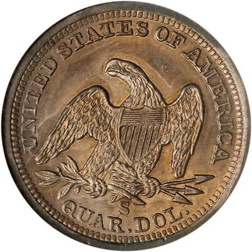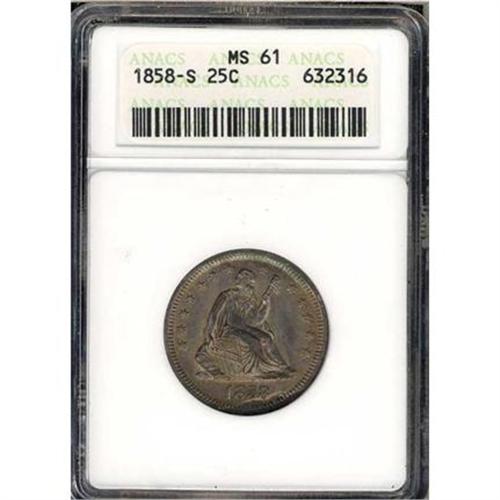 <b>1858-S Liberty Seated Quarter Dollar. ANACS graded MS61.</b> Medium toned in shades of antique gray and gold over very lustrous sharply struck surfaces. Would grade several grade points higher but for a small lamination or strike-through area below the date that is visible in the photographs. Only 121,000 were struck of the scarce 1858-S, all but a few of which seem to have entered circulation and stayed there for many years. An extreme grade rarity, this piece seems to be one of the very rare Mint States left in collectors' hands <b>(PCGS # 5447)</b>