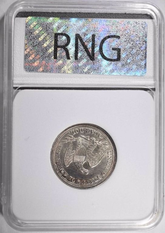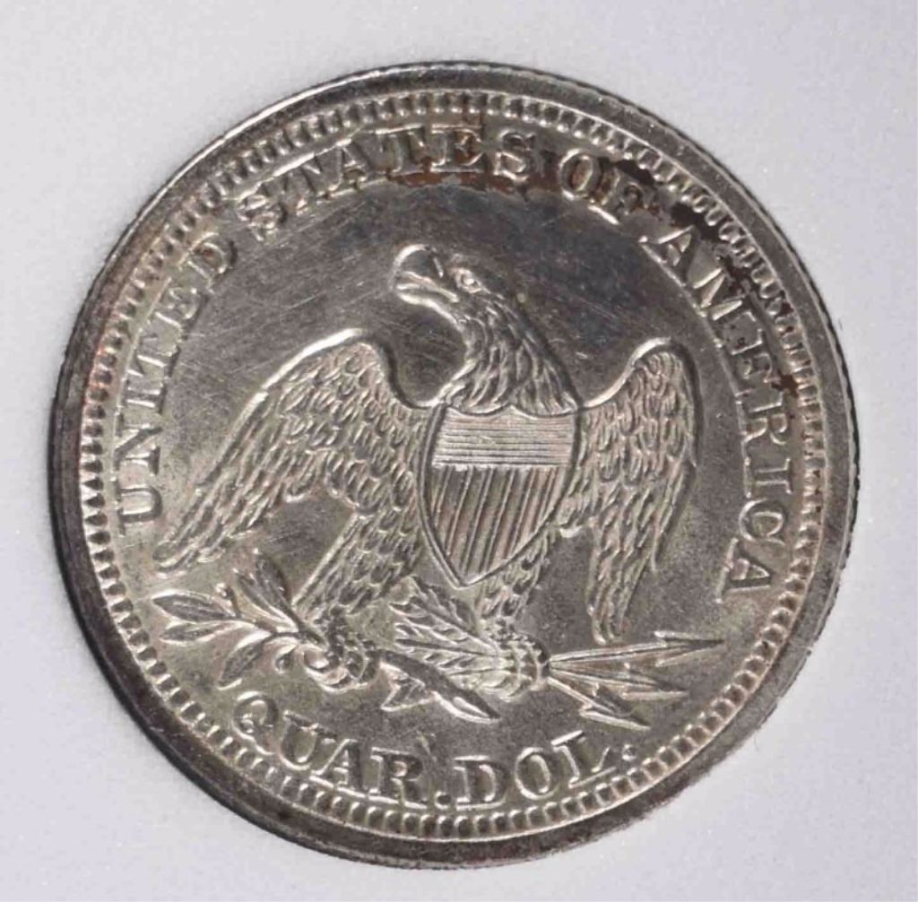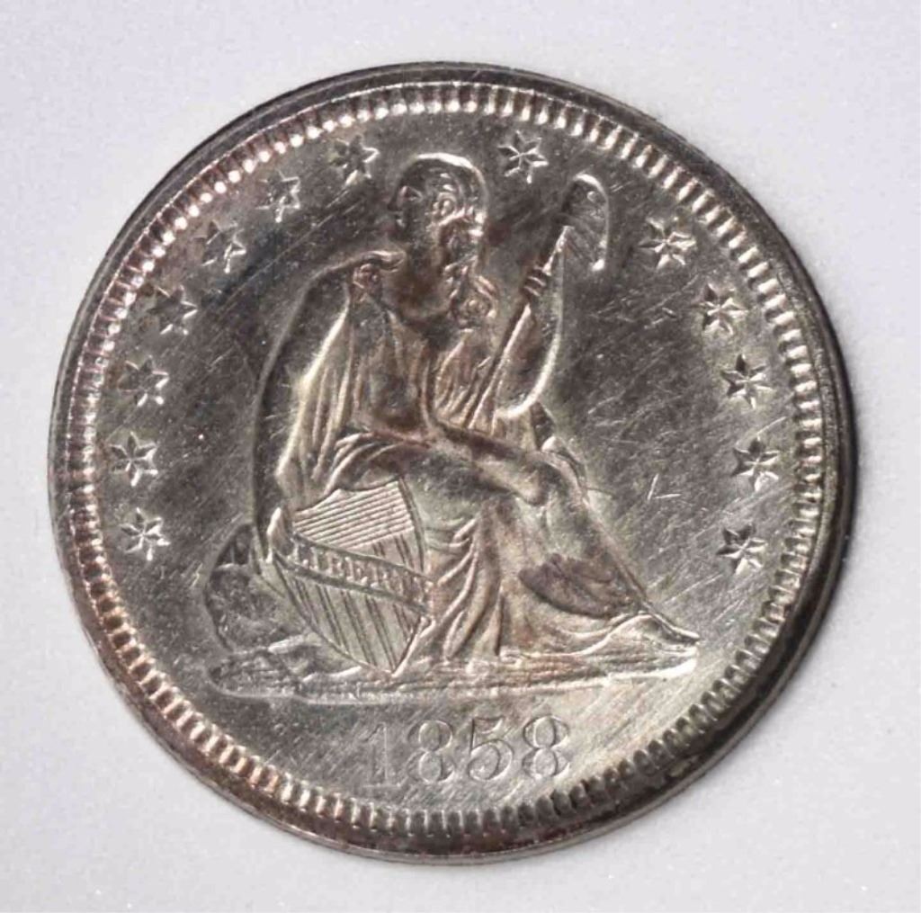 1858 SEATED LIBERTY QUARTER RNG CH BU ESTIMATE $425 - $450.
