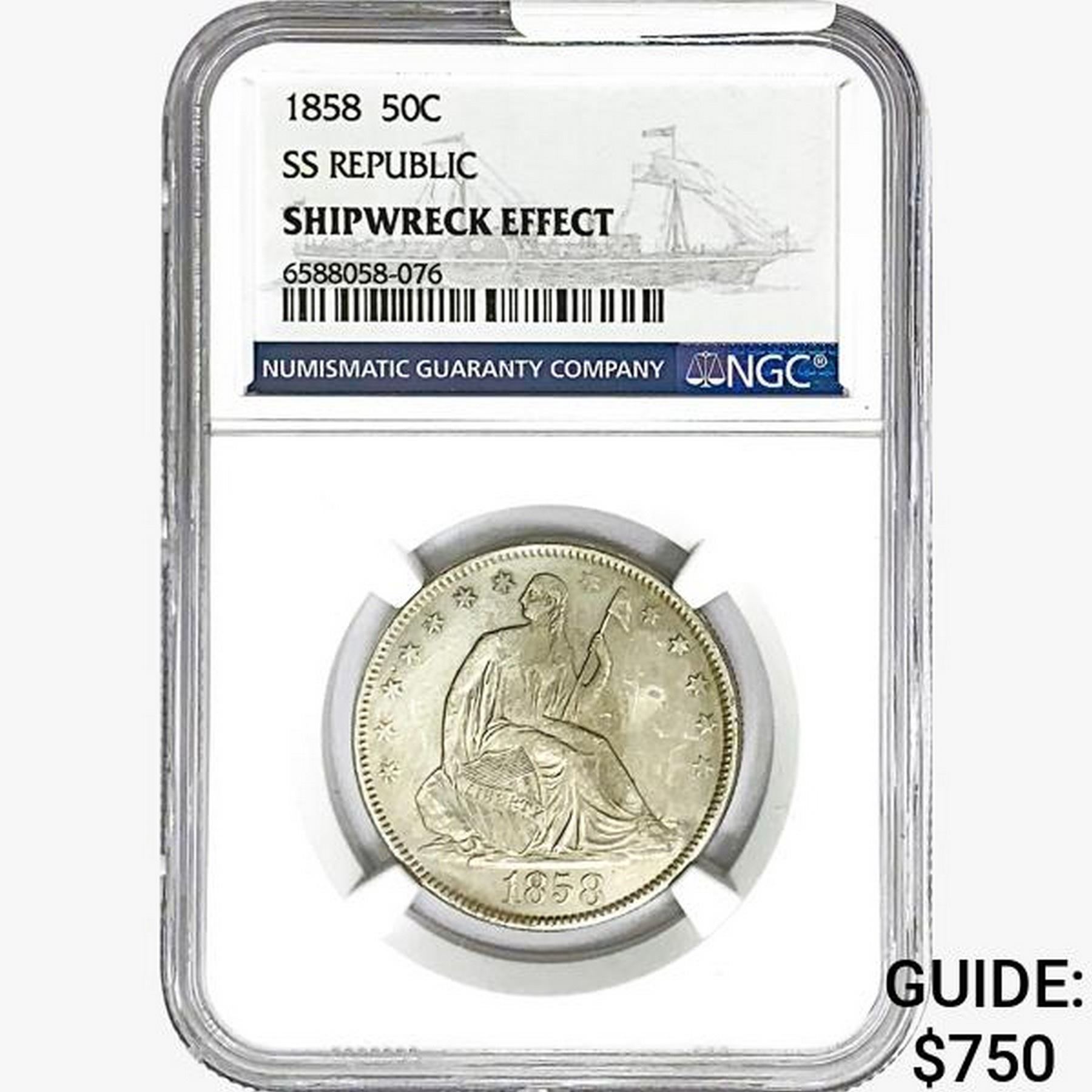 1858 Seated Lib. 50C NGC Shipwreck Effect SS REP.