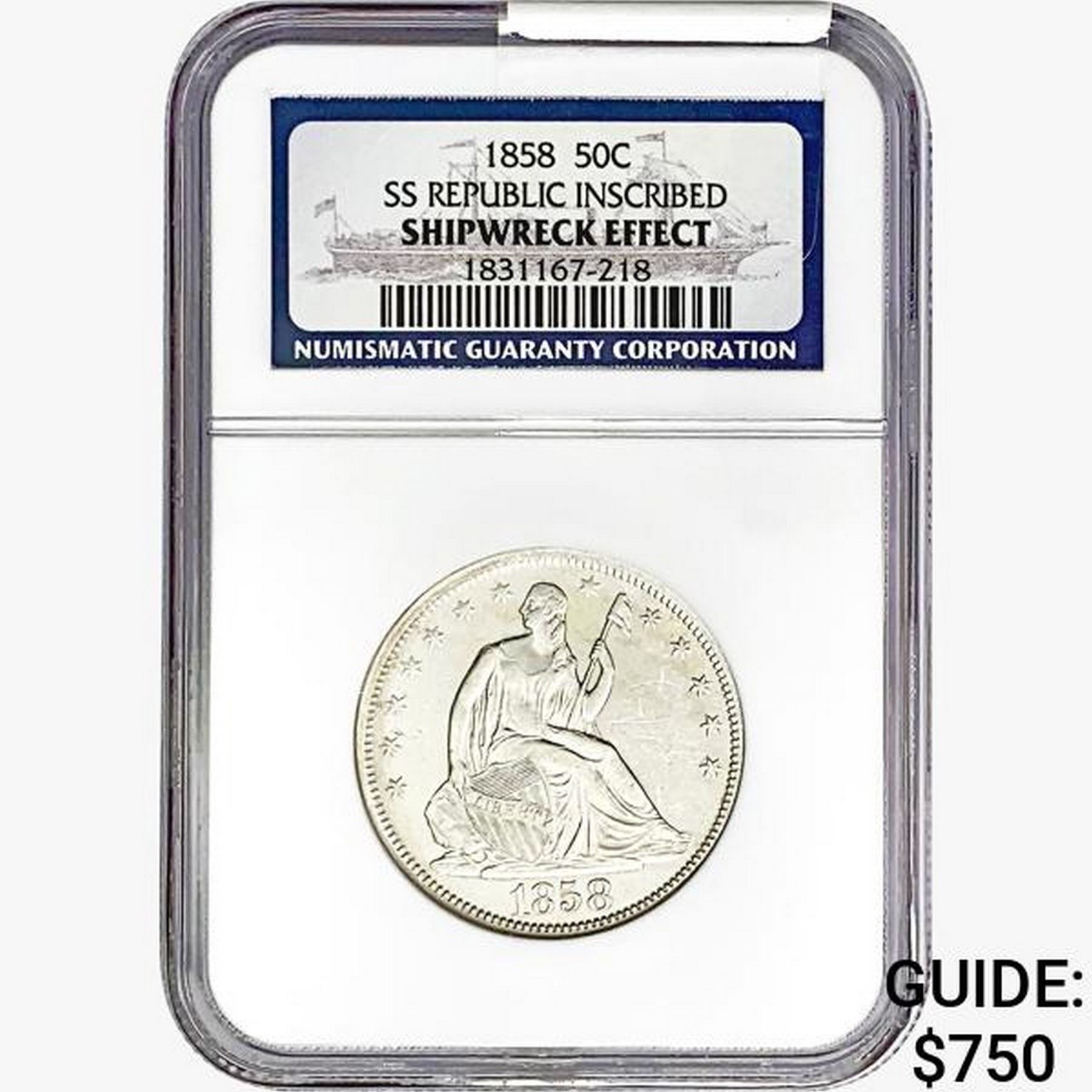 1858 Seated Lib. 50C NGC Shipwreck Effect SS REP.
