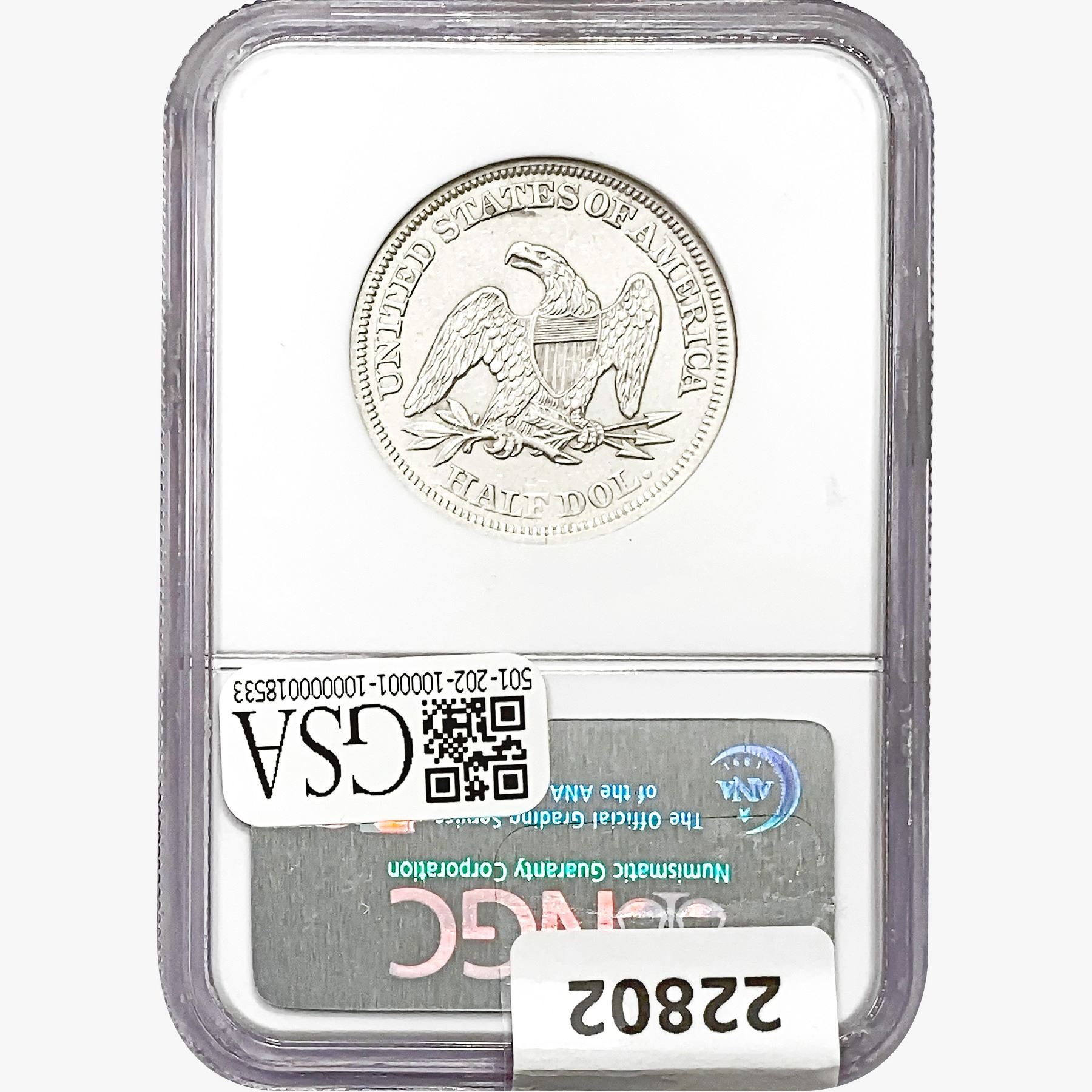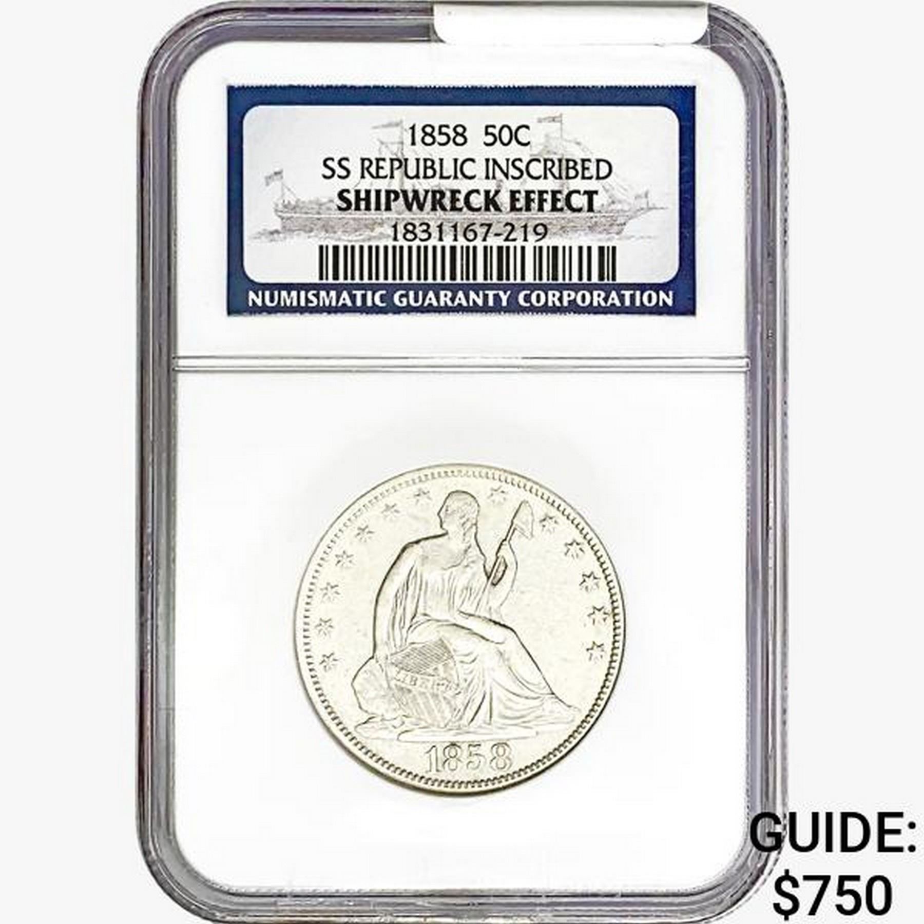 1858 Seated Lib. 50C NGC Shipwreck Effect SS REP.